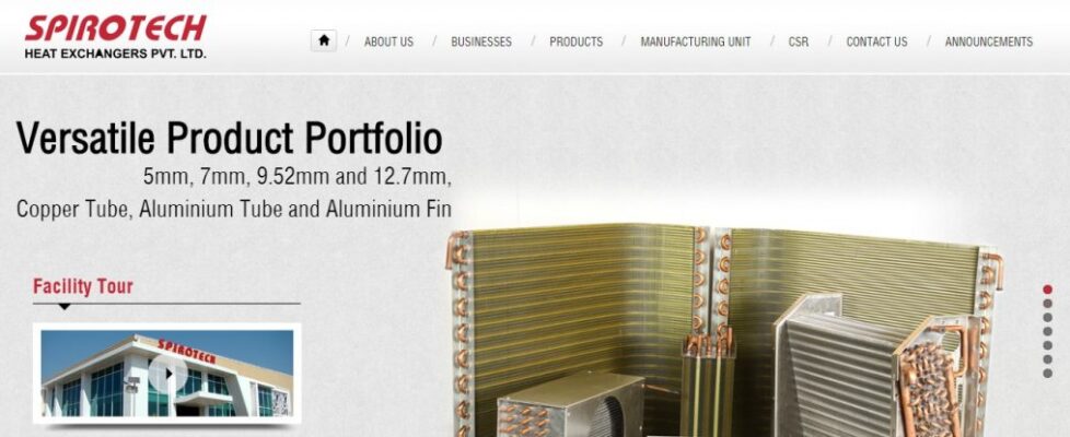 Spirotech è una società indiana con sede produttiva a Bhiwadi, nel Rajasthan, a circa 60 km a sud di Nuova Dehli, attiva nella produzione di scambiatori di calore rame/alluminio e alluminio/alluminio tecnologicamente avanzati, il cui fatturato è realizzato per oltre il 70% all’estero, con clienti le cui applicazioni finali sono destinate al mercato delle domestic appliances, del condizionamento e della refrigerazione. Fondata nel 1994 su iniziativa di Rajeshwar Kumar Malholtra e di Subramaniam Srinivasan, oggi rispettivamente Presidente e Amministratore Delegato della società.