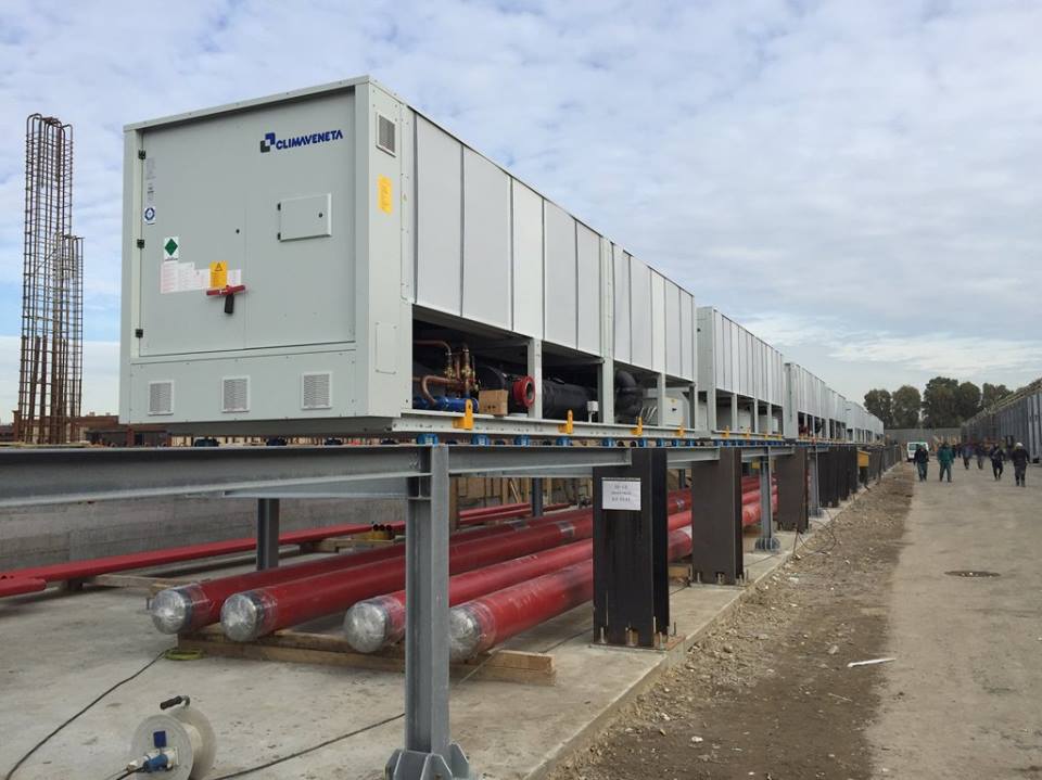 Gli impianti di refrigerazione, basati su unità Climaveneta, sono a basso impatto energetico, realizzati con sistemi di free-cooling centralizzato e geocooling. Nel dettaglio i gruppi frigo selezionati sono 3 TECS2/SL-CA-S 0913 e 5 i-FX(1+i)/CA-S 4202 / NR, per una potenza frigorifera totale di 7800 kW.