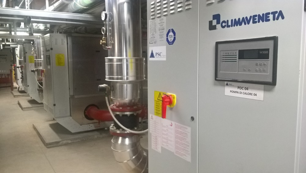 In quest’ottica va quindi vista la scelta dell’impianto di climatizzazione del centro, che si basa su unità a portata variabile che consentono di ottimizzare il consumo energetico sulla base dei reali carichi termici dell’edificio. La centrale termofrigorifera è composta da 5 pompe di calore polivalenti ERACS-2WQ3202 e 2 refrigeratori di liquido FOCS2WCA 9604, tutti condensati ad acqua e tutti a marchio Climaveneta. Le pompe di calore polivalenti sono in grado di produrre acqua calda e fredda simultaneamente sfruttando il recupero nella produzione di entrambi i liquidi e quindi massimizzando l’efficienza energetica dell’edificio durante tutto l’anno.