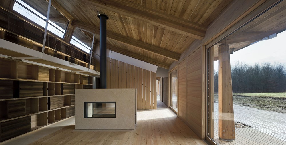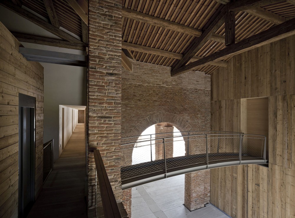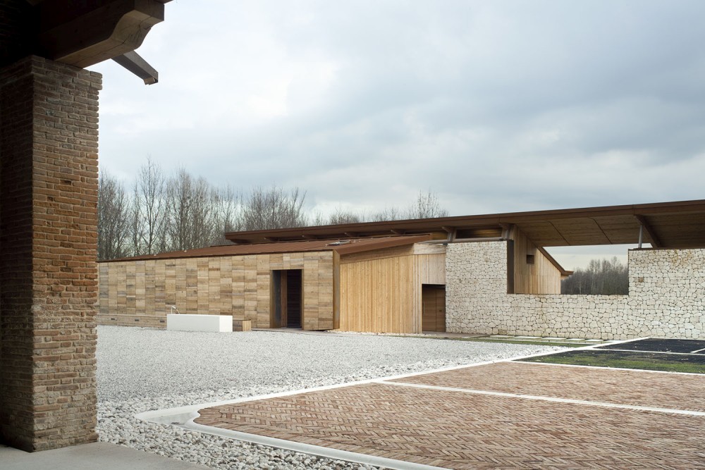 La forma della copertura è stata defi­nita per il controllo della luce naturale e per le sue potenzialità fotovoltaiche: 60 KW capaci di alimentare le attività agricole della Corte. A sud–est sorge il volume con rivestimento in larice che ospita il centro culturale, dedicato alla didattica e alla valorizzazione del paesaggio boschivo circostante. All’interno delle barchesse e degli edi­ci storici si articolano invece gli alloggi dell’agriturismo, gli spazi di aggregazione della fattoria sociale, i laboratori di trasformazione e gli spazi per la vendita al pubblico dei prodotti agricoli.