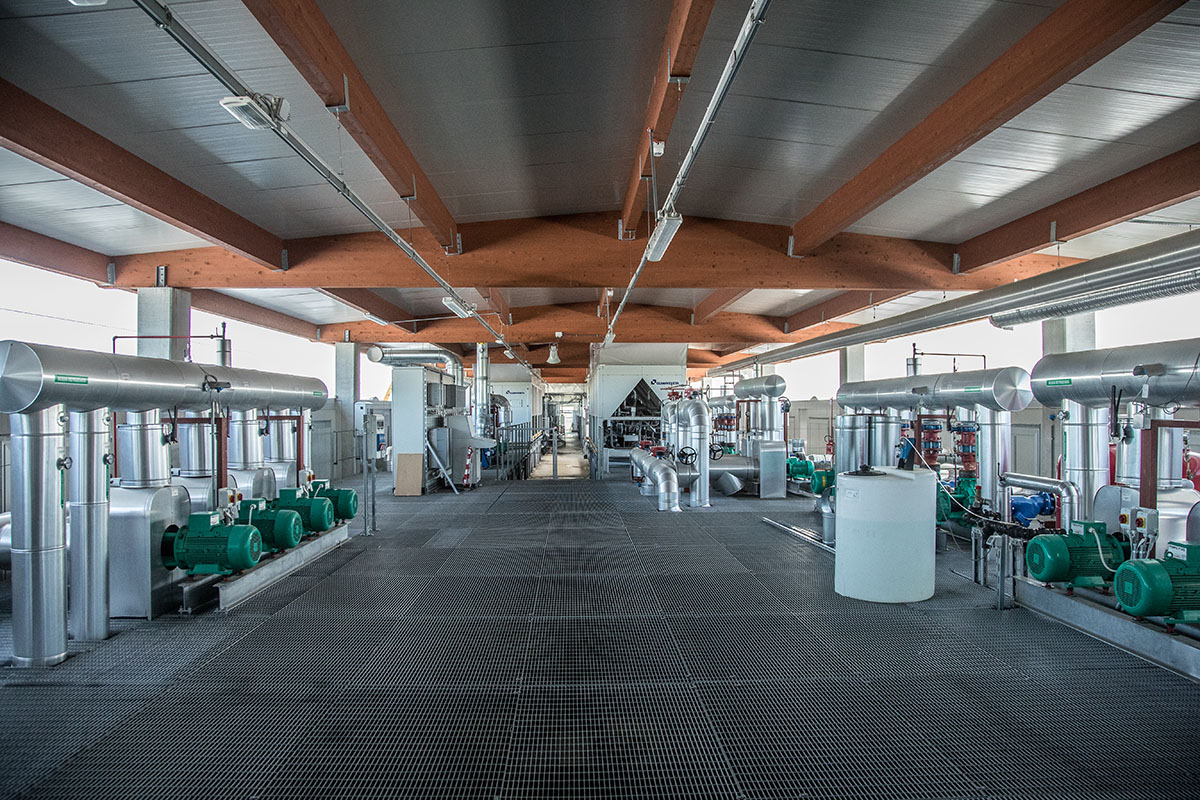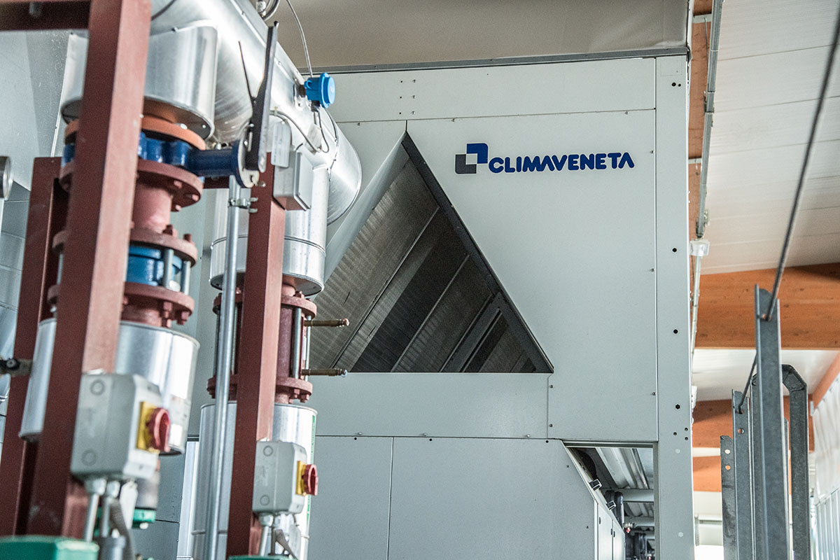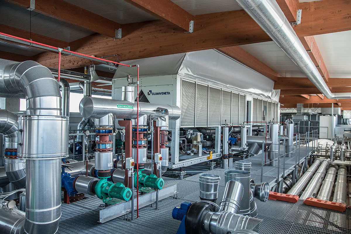 Anche la centrale frigorifera, realizzata in un grande spazio ricavato sotto la copertura in legno, consente la massima flessibilità all’impianto di climatizzazione e trattamento aria. La sua posizione centrale permette inoltre di ottimizzare sempre la lunghezza di canali e tubazioni, riducendo le perdite di carico e massimizzando così le prestazioni dell’impianto.