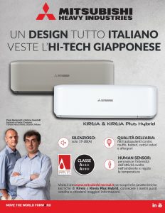 Al centro dell’adv, dal claim “Un design tutto italiano veste l’hi-tech giapponese”, ci sono i climatizzatori della serie Kireia & Kireia Plus Hybrid, prodotti di punta firmati Mitsubishi Heavy Industries e distribuiti dal Gruppo Termal di Bologna, in cui tecnologia e design si armonizzano in modo unico e raffinato.