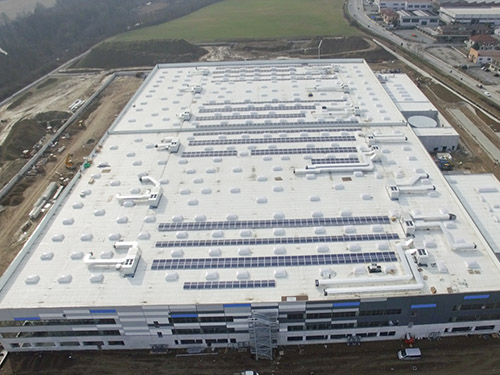 La climatizzazione è affidata a 15 unità roof top reversibili con sorgente aria ad elevata efficienza di tipo WSM di Climaveneta. 10 di queste unità sono dedicate agli spazi aperti, 4 solo ai mezzanini meccanizzati ed 1 ai laboratori, per una portata d’aria totale di circa 340.000 m3/h.