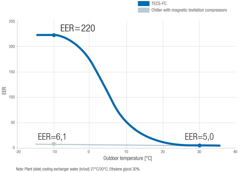 TECS-FC dispone di un sistema di gestione del free-cooling altamente intelligente: in base alla temperatura esterna e dell’acqua, il chiller automaticamente passa da una modalità di free-cooling totale, ad una refrigerazione di tipo ibrido o meccanico. Non appena la temperatura dell’aria esterna scende di un grado al di sotto della temperatura dell’acqua di ritorno, l’unità inizia ad impiegare l’aria per raffreddare l’acqua in modo diretto (free-cooling ibrido), beneficiando gradualmente degli effetti del free-cooling. I vantaggi aumentano con la diminuzione della temperatura, fino a quando la sola aria esterna soddisfa l’intera richiesta frigorifera: in questa situazione i compressori rimangono totalmente spenti (free-cooling totale) e l’unità raggiunge il suo picco massimo di efficienza (valori EER attorno a 220).