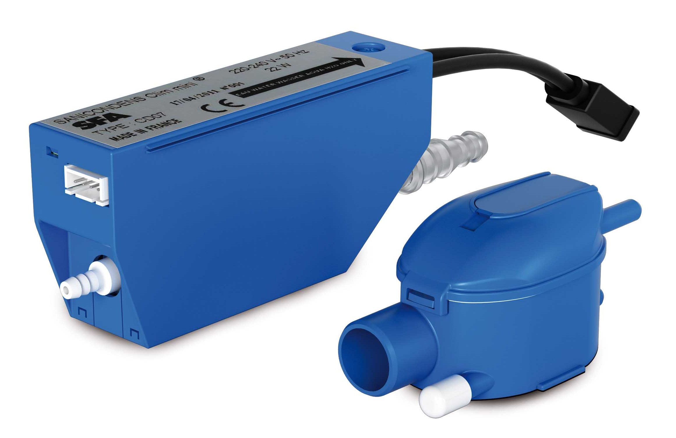 Sanicondens Clim Mini: pompa di scarico condensa per gli split dei condizionatori. Le sue piccole dimensioni le permettono di integrarsi facilmente in un climatizzatore a muro. Capace di aspirare fino a 2 m, ha un lieve impatto acustico. Sanicondens Clim Mini è costituita da due elementi principali: il blocco sensore ed il blocco pompa. La condensa penetra nel blocco di rilevamento, quando il livello al suo interno è sufficientemente elevato, la pompa scatta ed aspira la condensa per poi scaricarla.