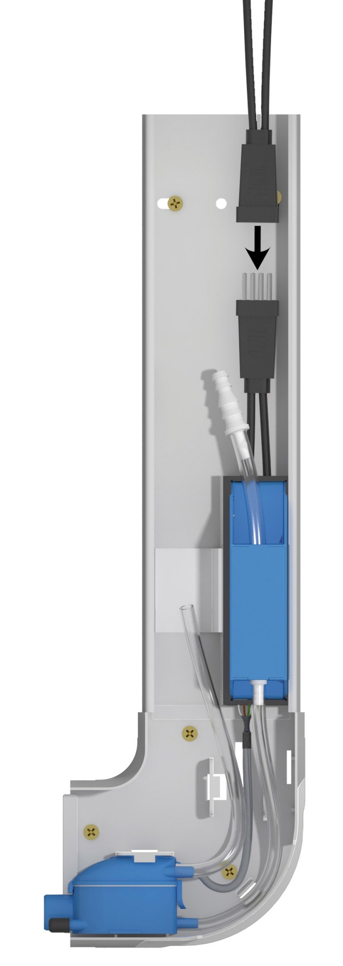 Sanicondens Clim Pack: kit pronto all’uso che comprende la pompa SANICONDENS Clim Mini, una canalina, la placca di Sanicondens_ClimPackfissaggio al muro e gli accessori di fissaggio.